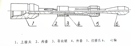 提放式撈矛是一種內(nèi)撈工具。既象油管一樣,與落魚上部的油管接箍對扣,通過換瓦又能撈無扣管柱,然后靠心軸錐面脹開打撈爪咬緊接箍或管柱。當落魚嚴重遇卡時可順序下放,然后上提管柱即可退出打撈工具,避免事故復(fù)雜化,即減輕工人勞動強度,又可縮短修井周期。
